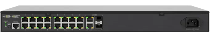 The SW-505-16P-R is a 16 port PoE+ rear-facing single-space rackmount 1Gb switch with 2RJ45/SFP 1Gb ports (aggregable up to 2Gbps) with a total PoE power budget of 185W. Each of the SFP ports can be used alone or aggregated together up to 4Gbps. This L2/L3 switch with 36Gbps switching capacity provides VLAN, QoS and other powerful management features. Up to 16 switches can be grouped in a single pane user-interface allowing easy and comprehensive administration. Variable speed fans for quiet operation. ProWatch compatible for support of remote monitoring and management. ACL ingress filtering.
